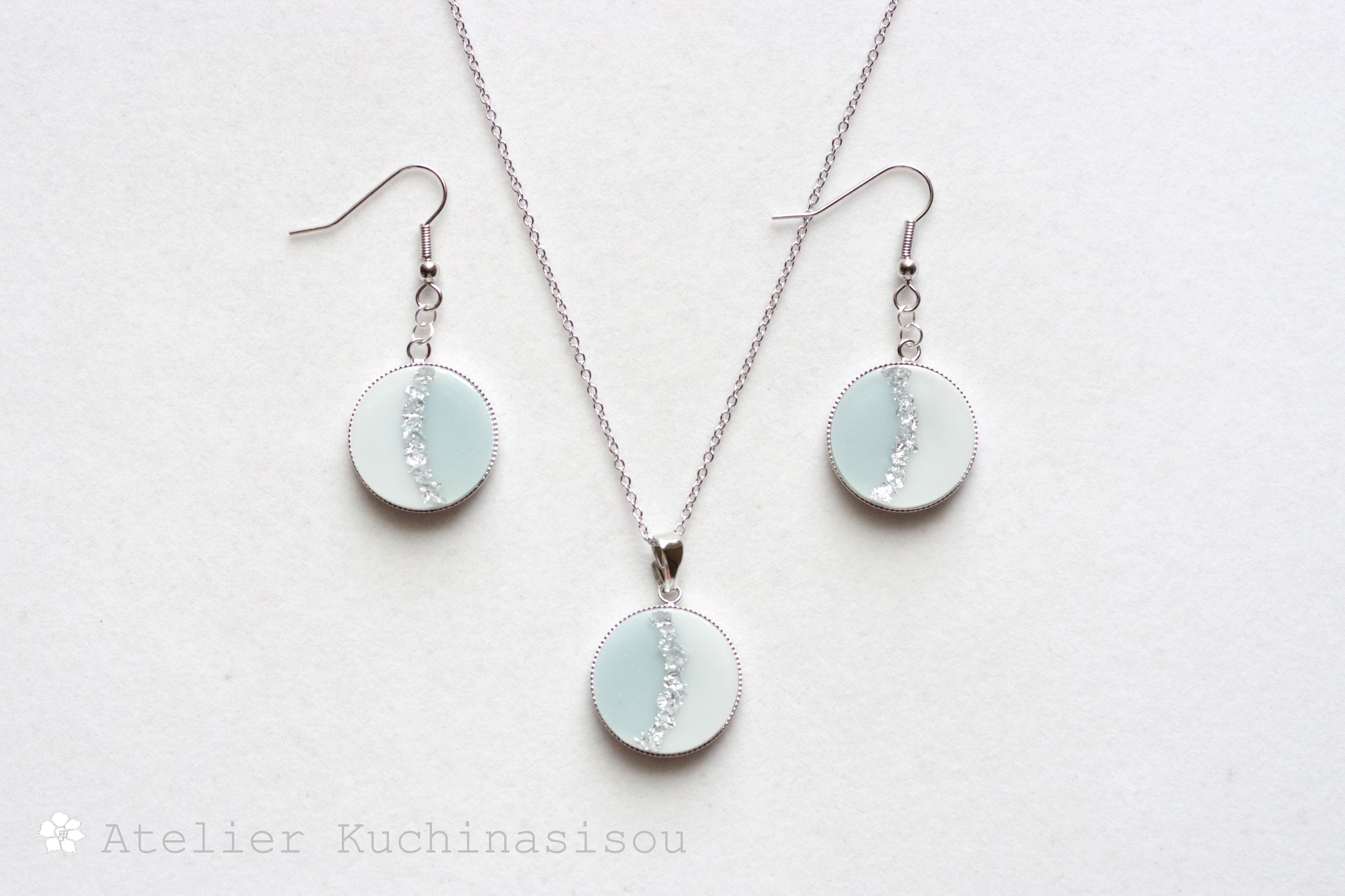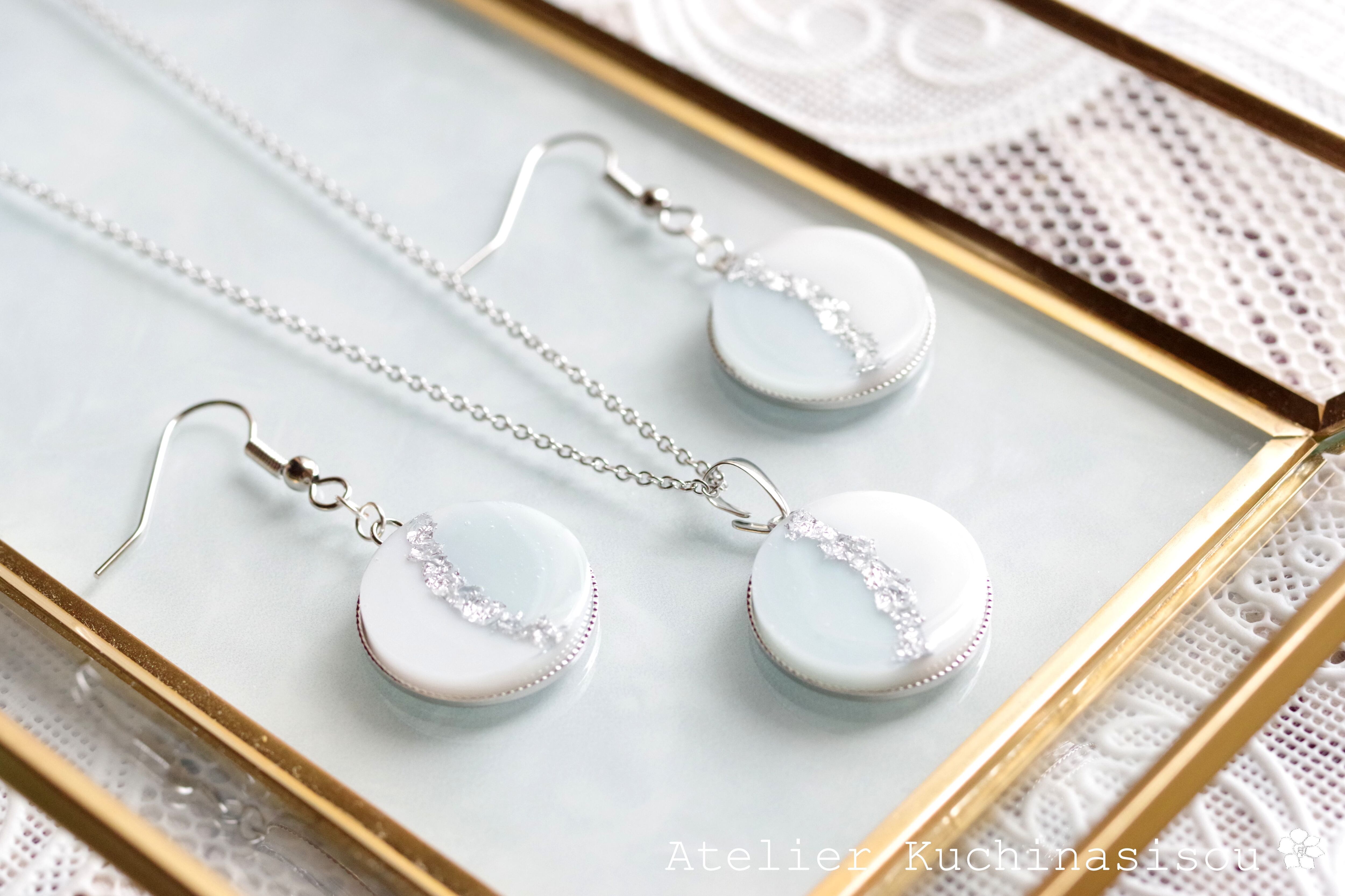 白と淡い水色が爽やかで優しいカラーリングのピアス。極々薄い青を使うことで繊細さを表現しています。