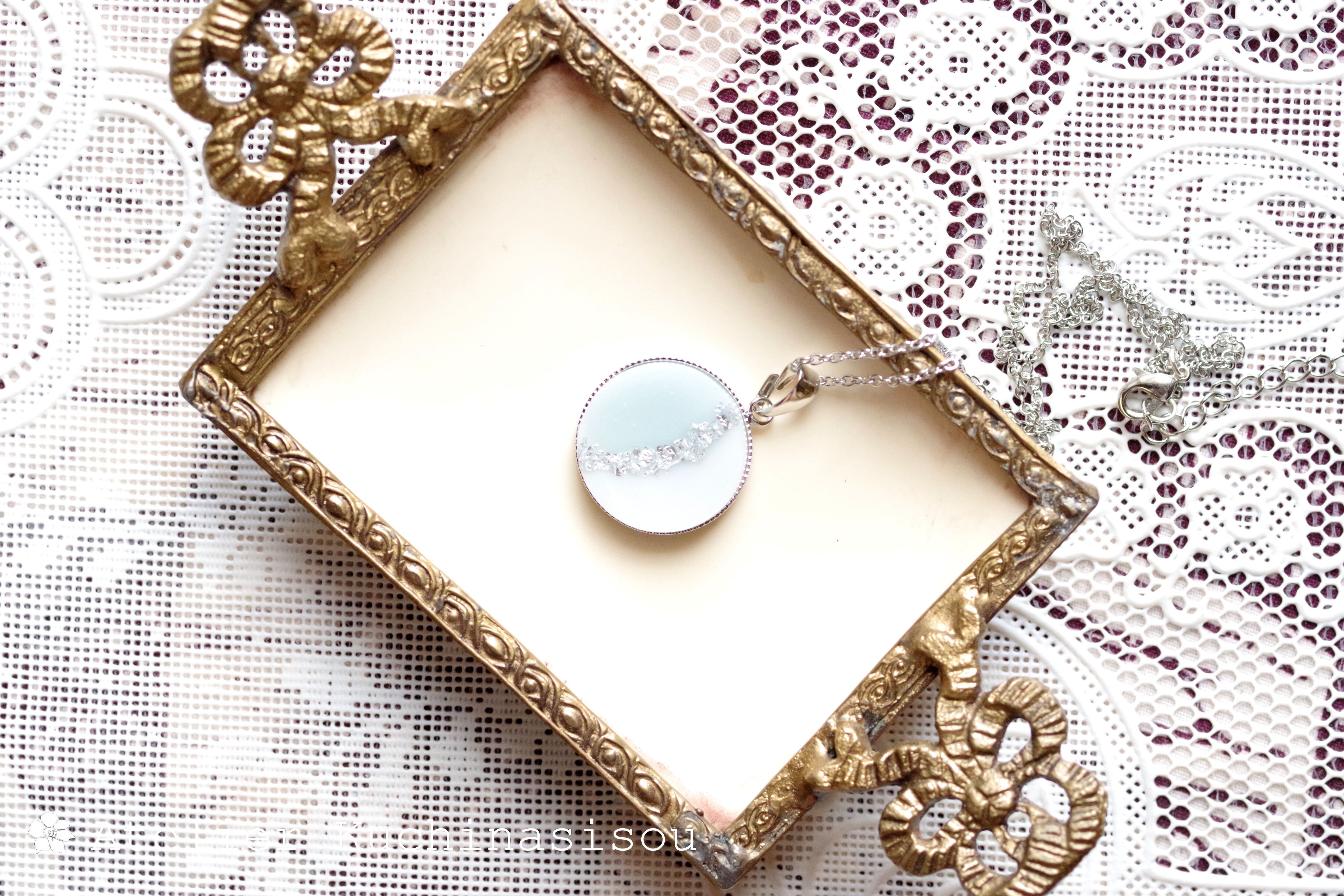白と淡い水色が爽やかで優しいカラーリングのペンダント。極々薄い青を使うことで繊細さを表現しています。