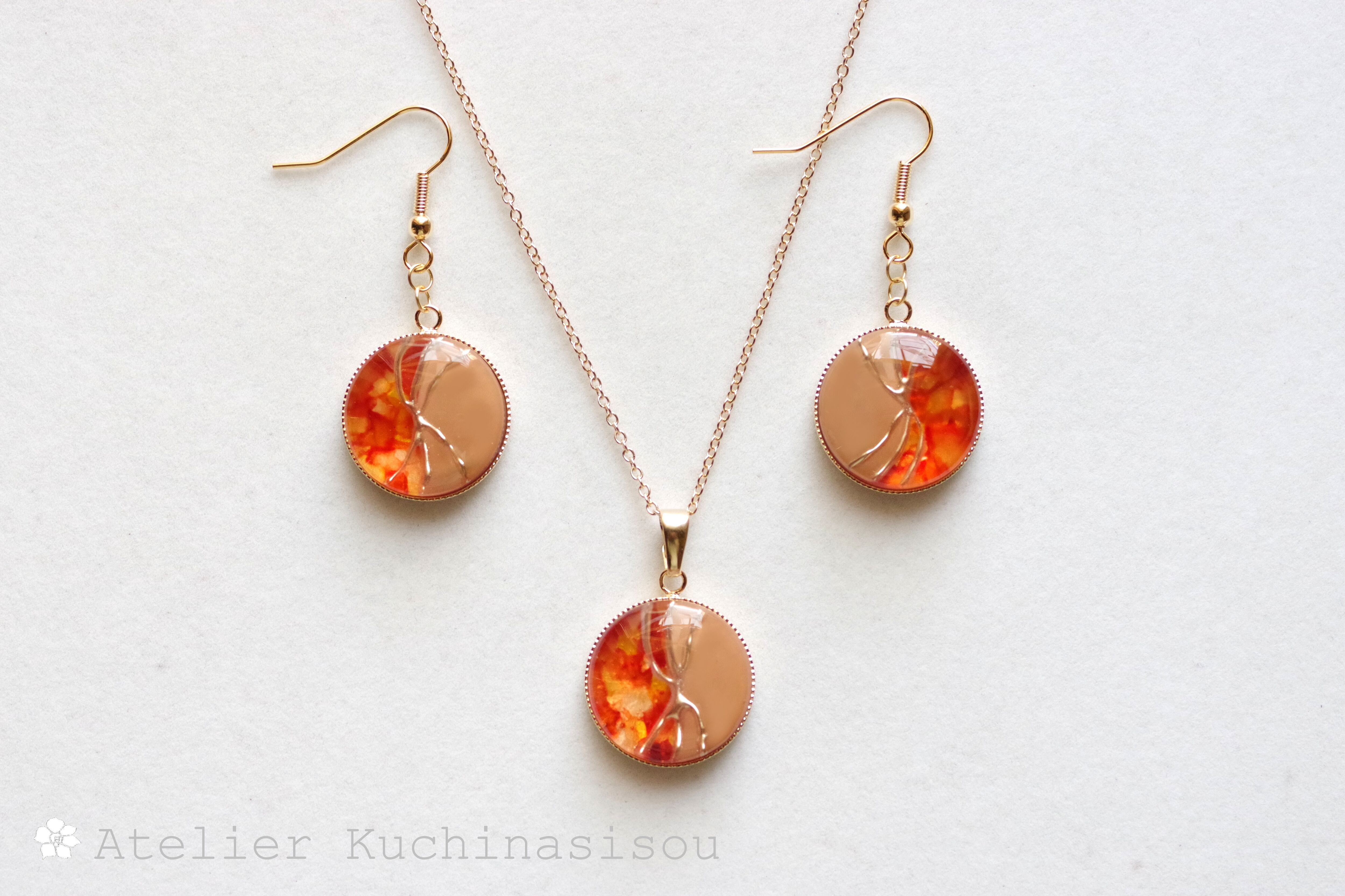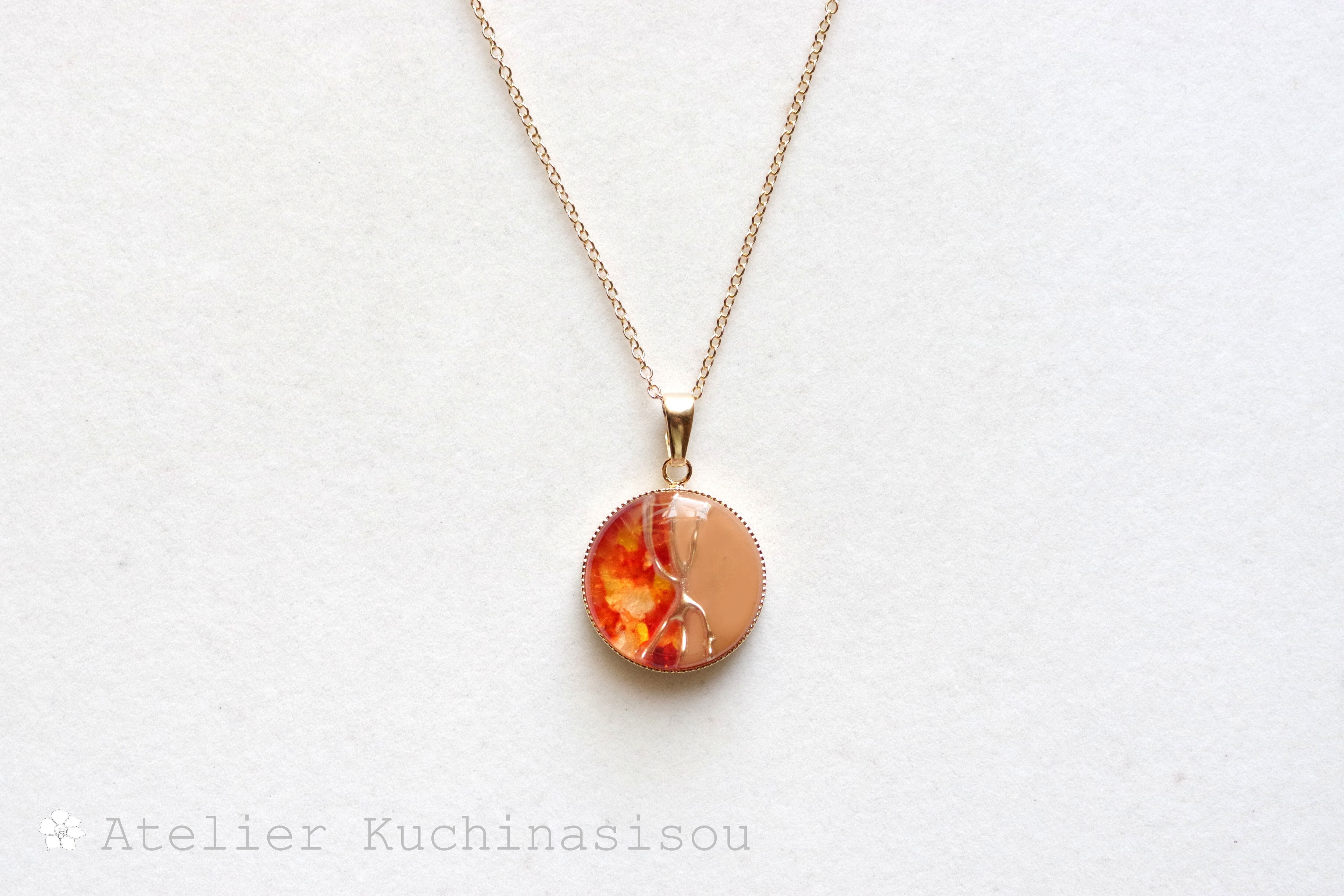明るく鮮やかな透明感のあるオレンジとベージュがバイカラーになった美しいペンダント。