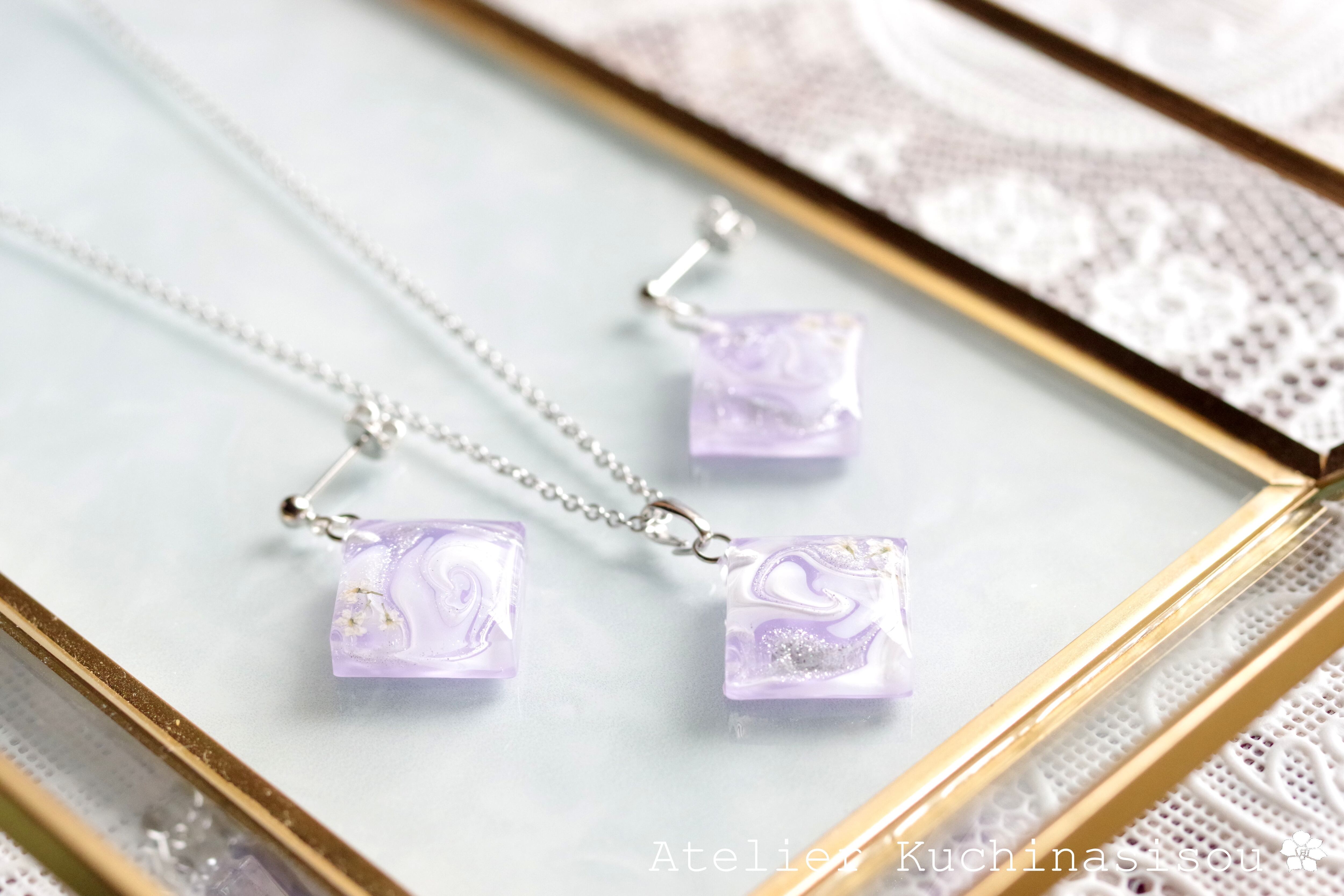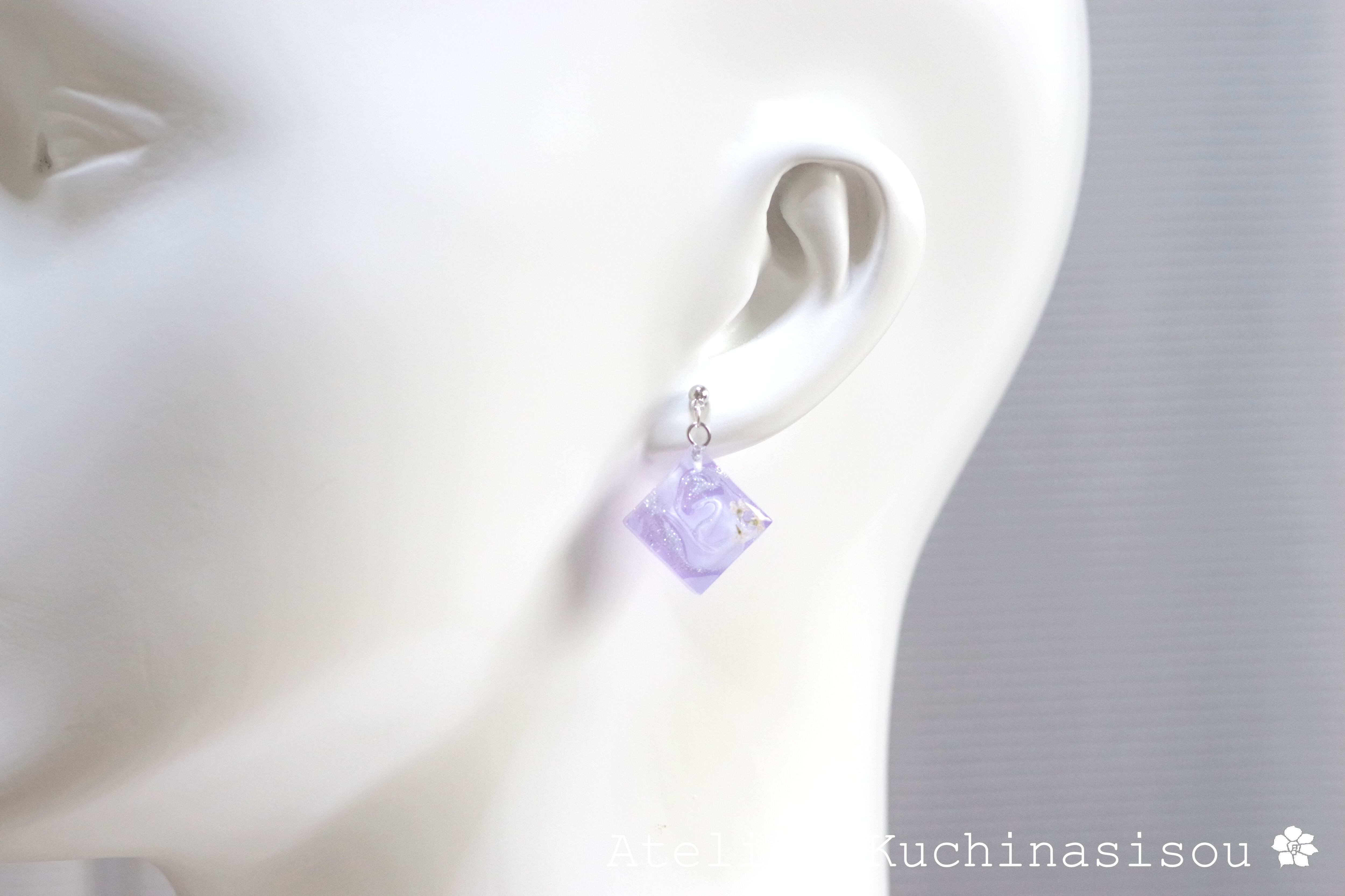 白とシルバーのマーブル模様の隙間から覗く淑やかな紫が優美なピアス。