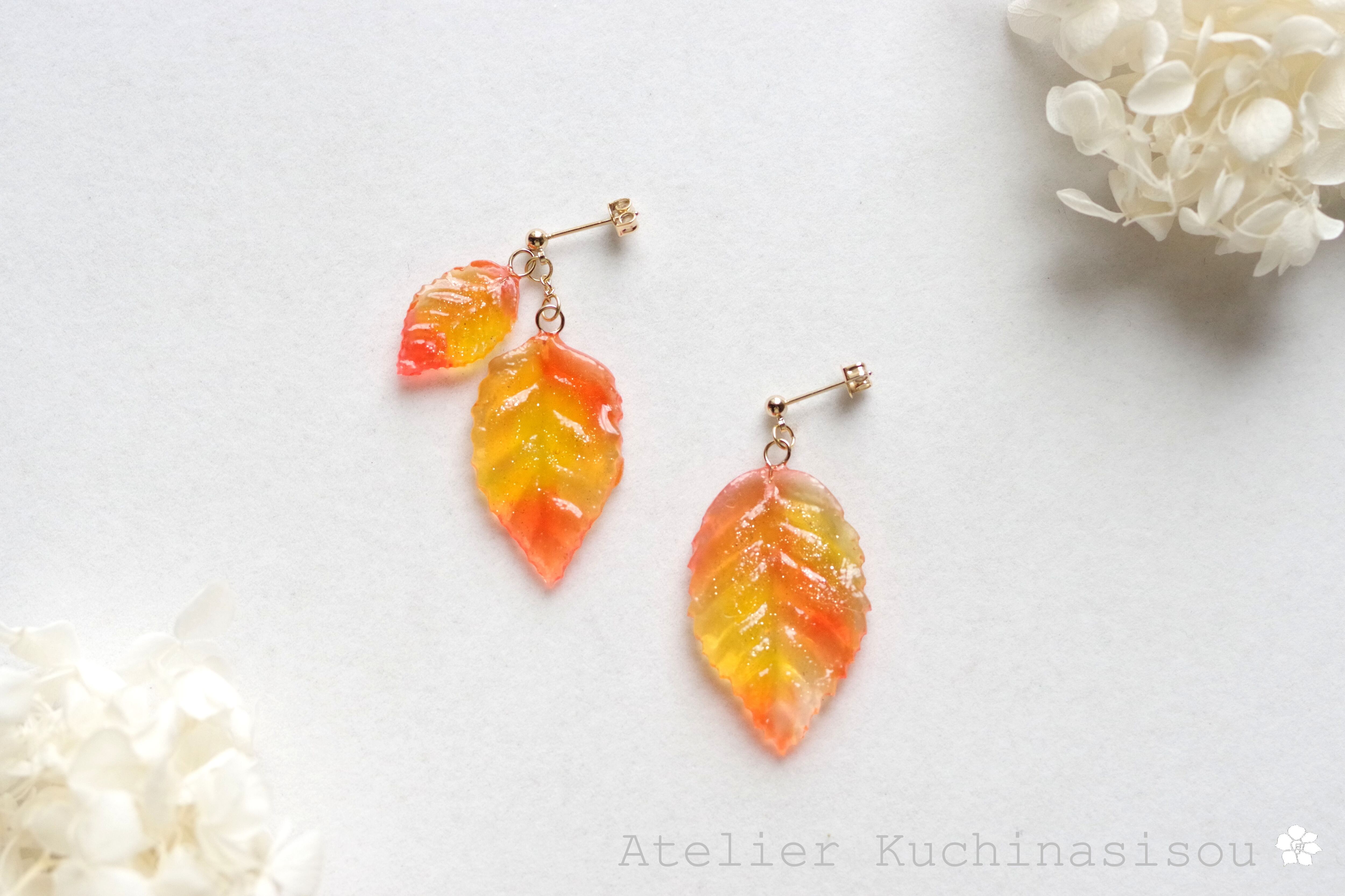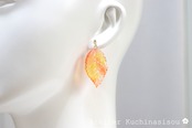 オレンジとイエローが混ざり合った濃淡ある葉っぱをアシンメトリーに配置したピアス。