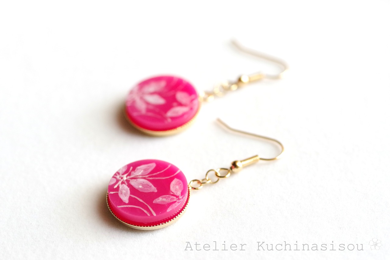 ローズピンクの背景に白いお花を咲かせたシンプルなデザインのピアス。