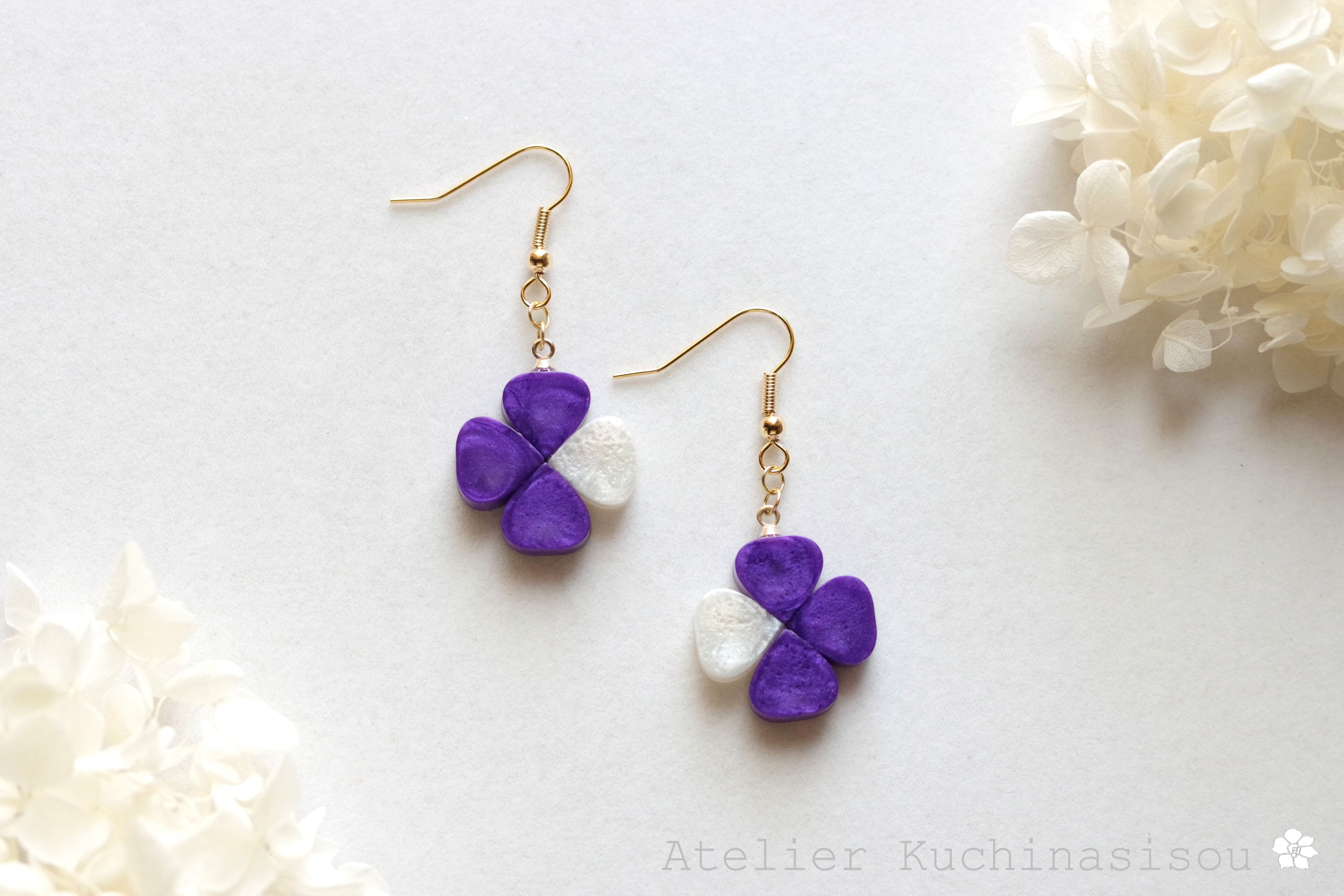 こっくりとした光沢のある紫と真珠色の組み合わせが大人っぽいピアス。