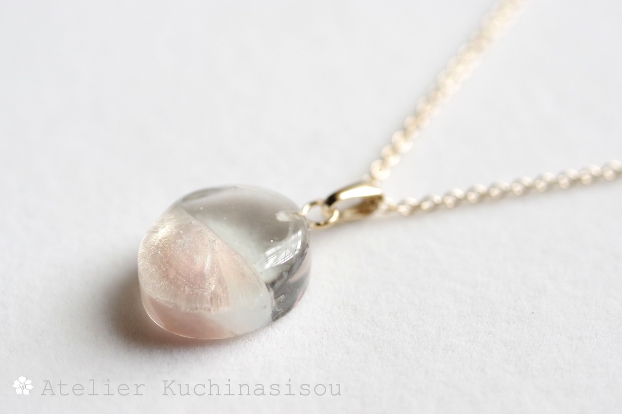 透明な上半分と、優しい光沢のあるホワイトベージュのマーブルが美しい下半分とのコントラストが上品なペンダント。