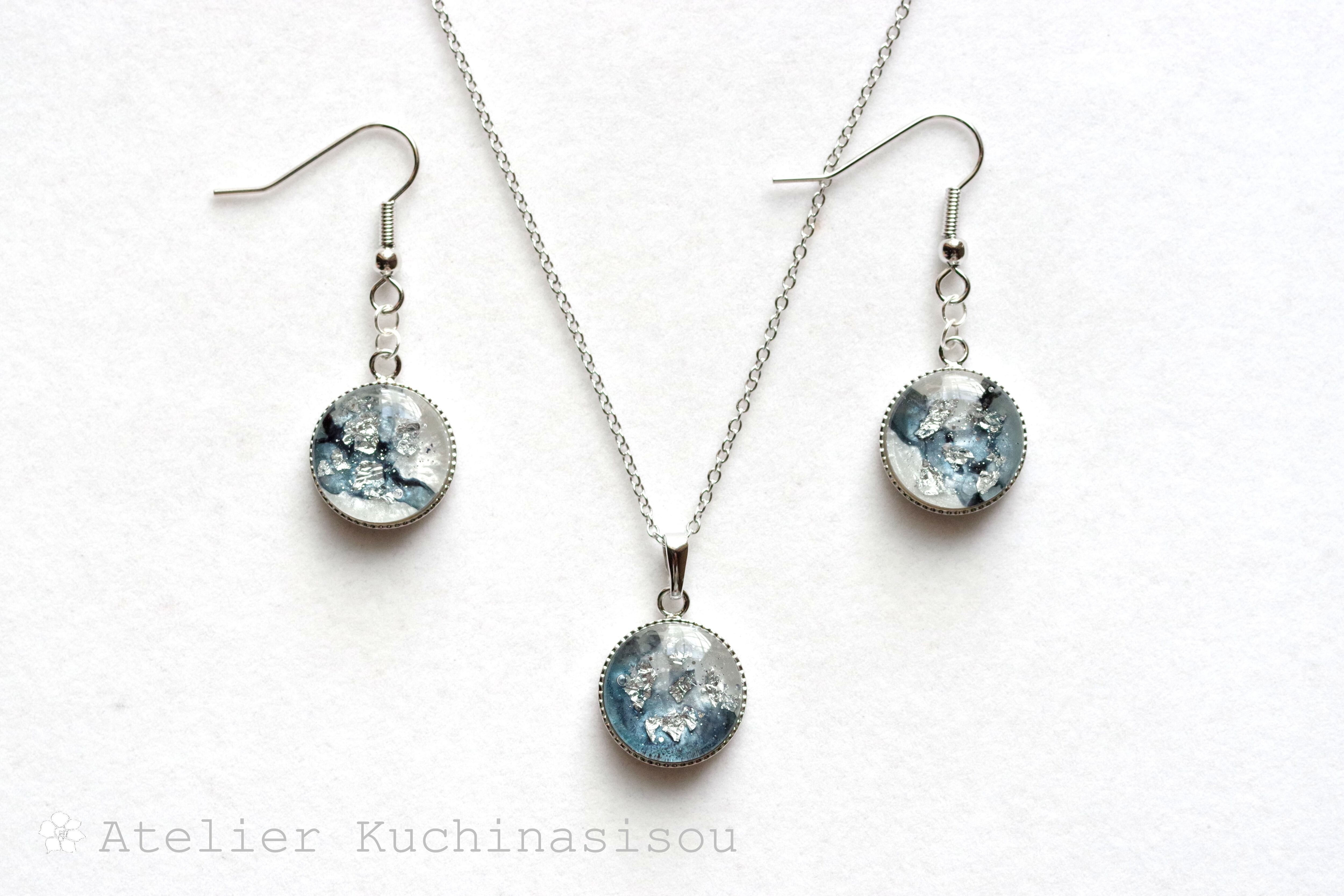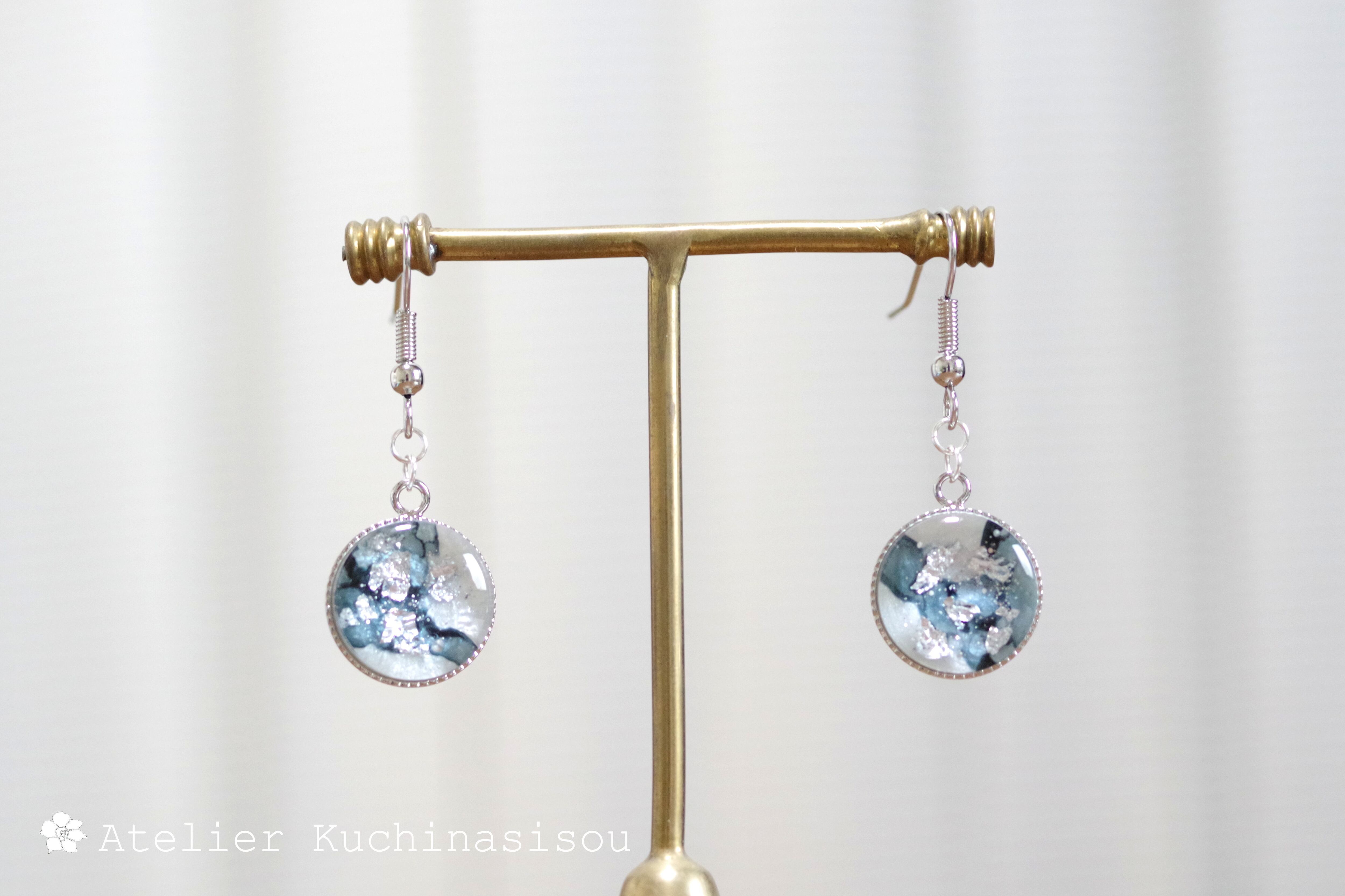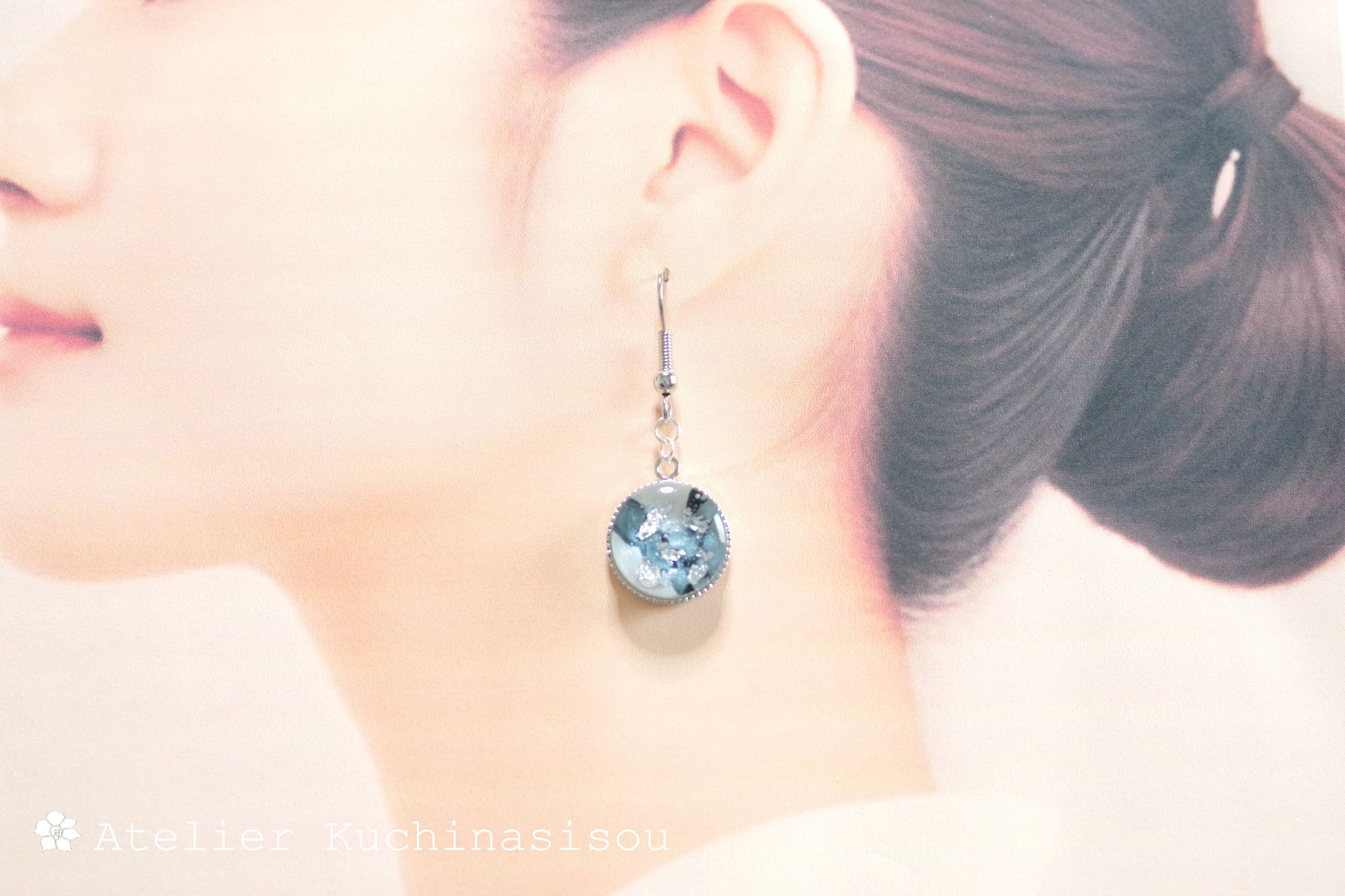 落ち着いたブルーグレーと銀箔が繊細な印象で耳元を飾るピアス。