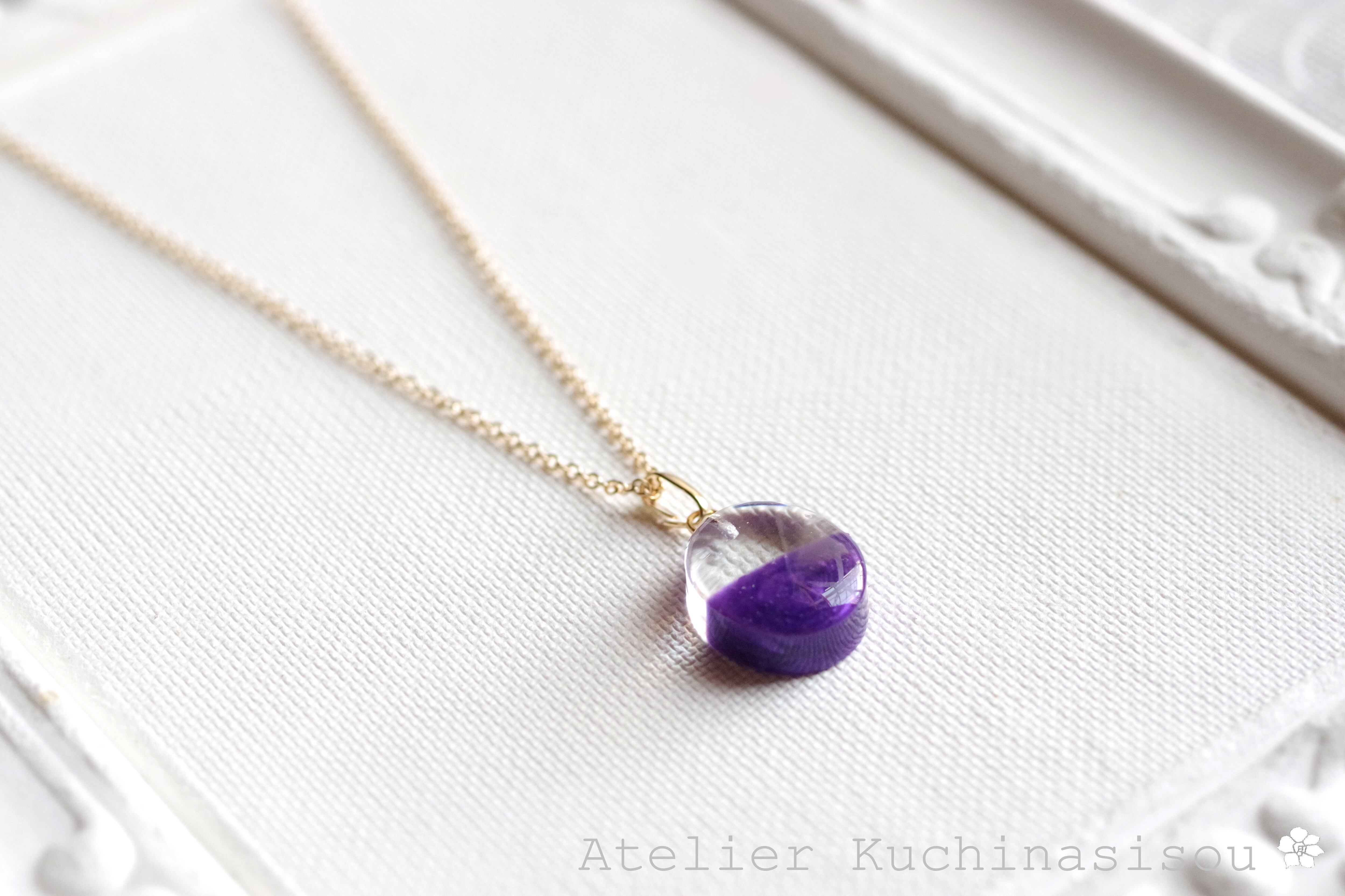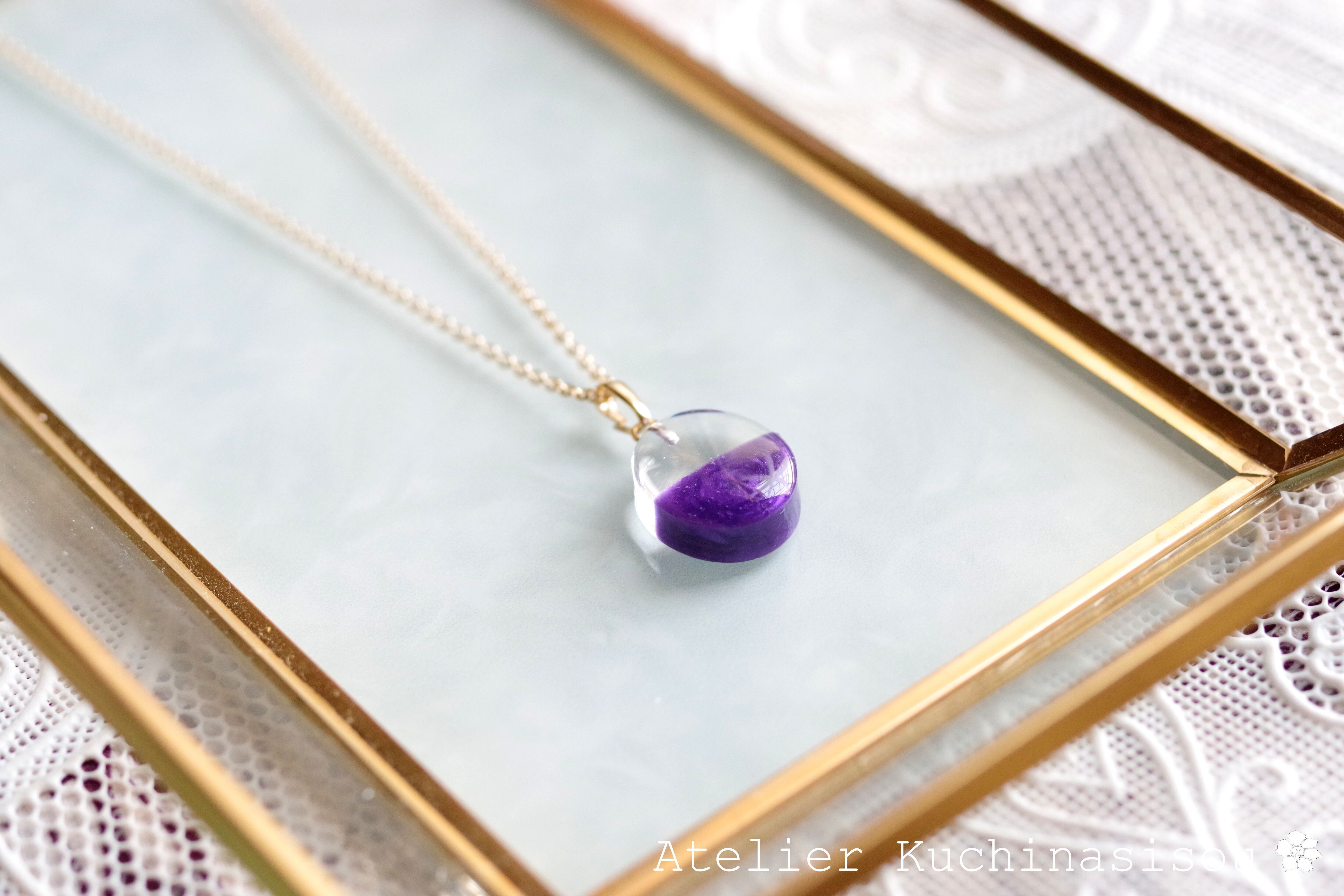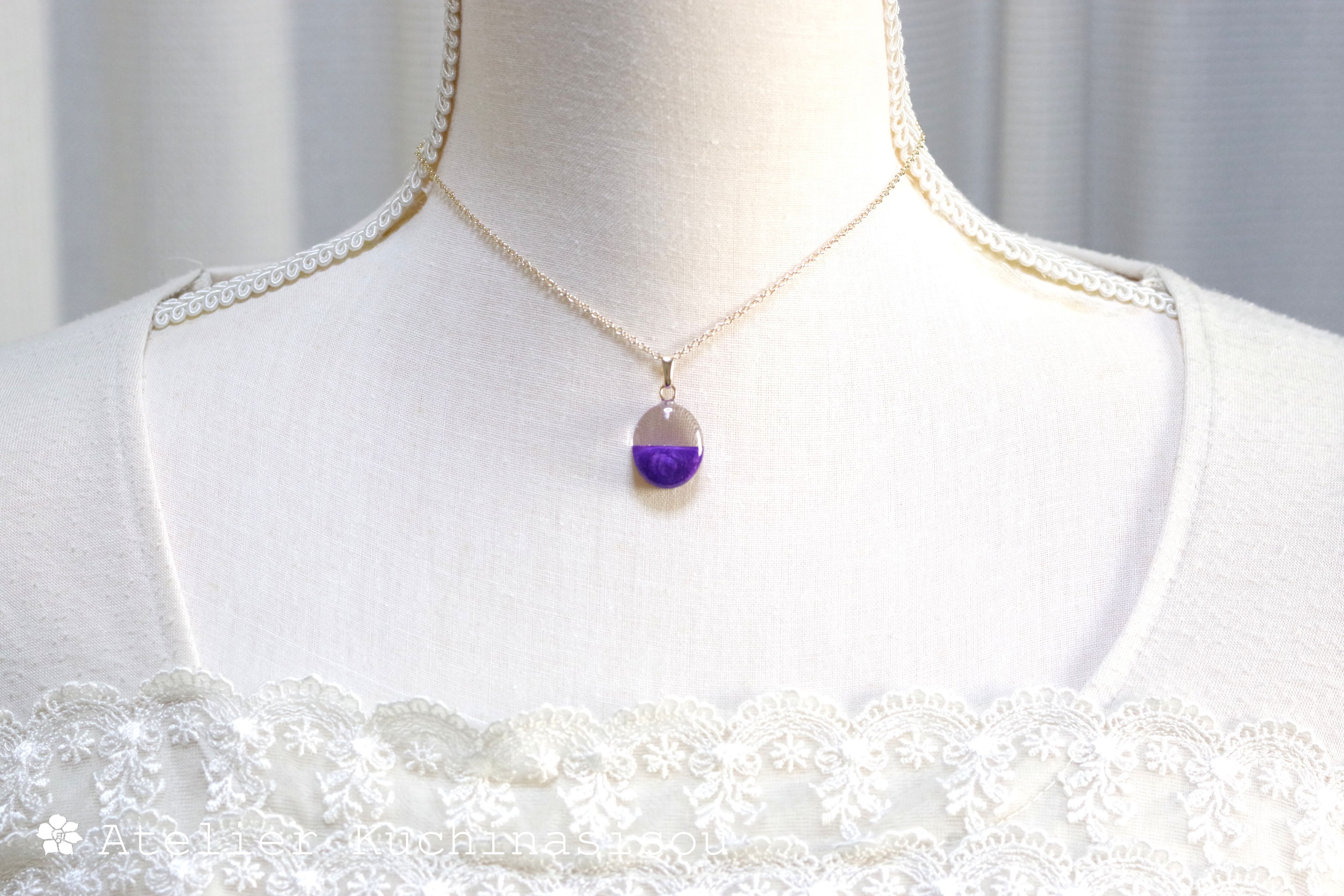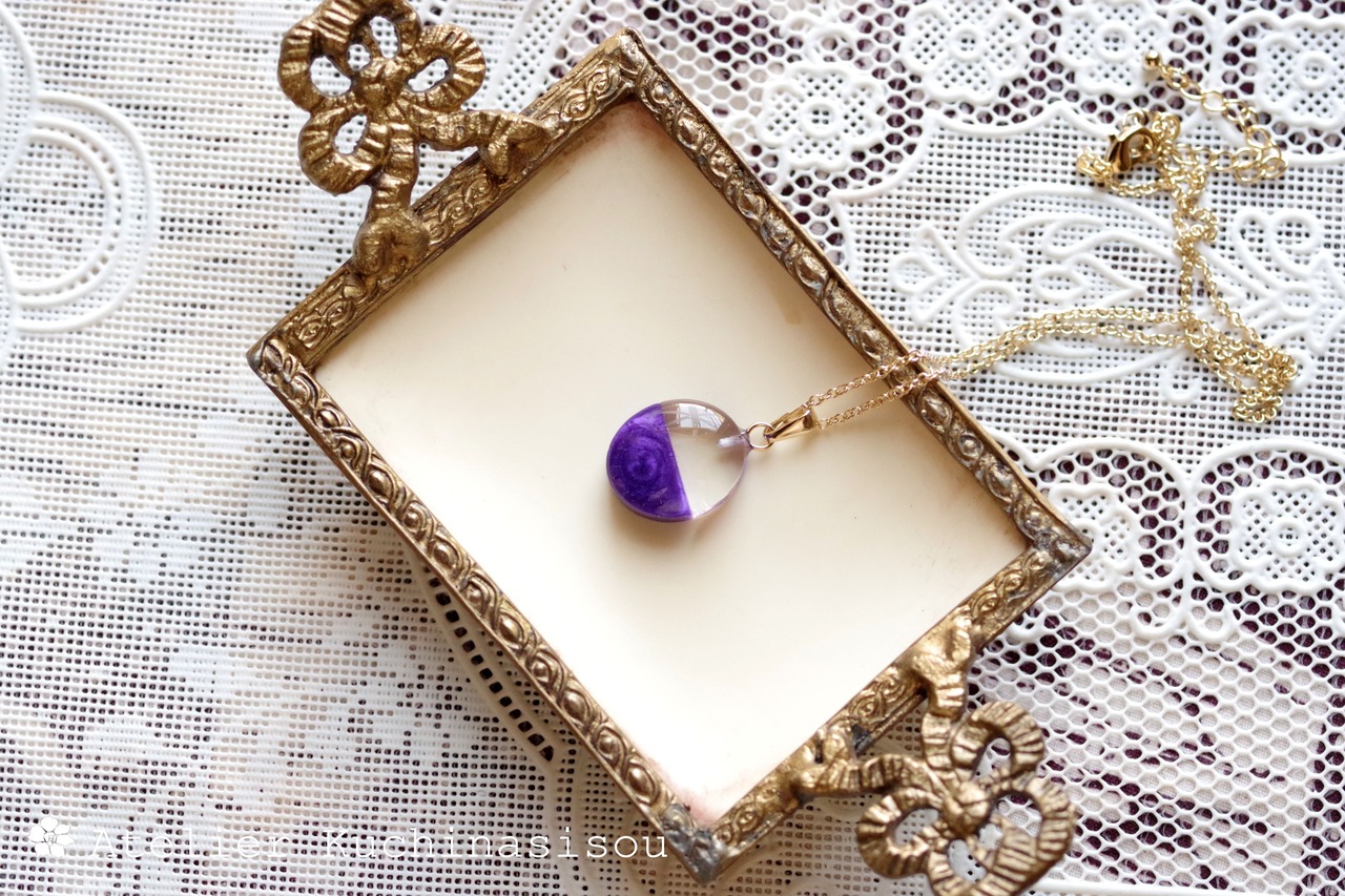 透明な上半分と、しっとりとした情緒的な光沢のある紫という下半分とのコントラストが鮮やかなペンダント。
