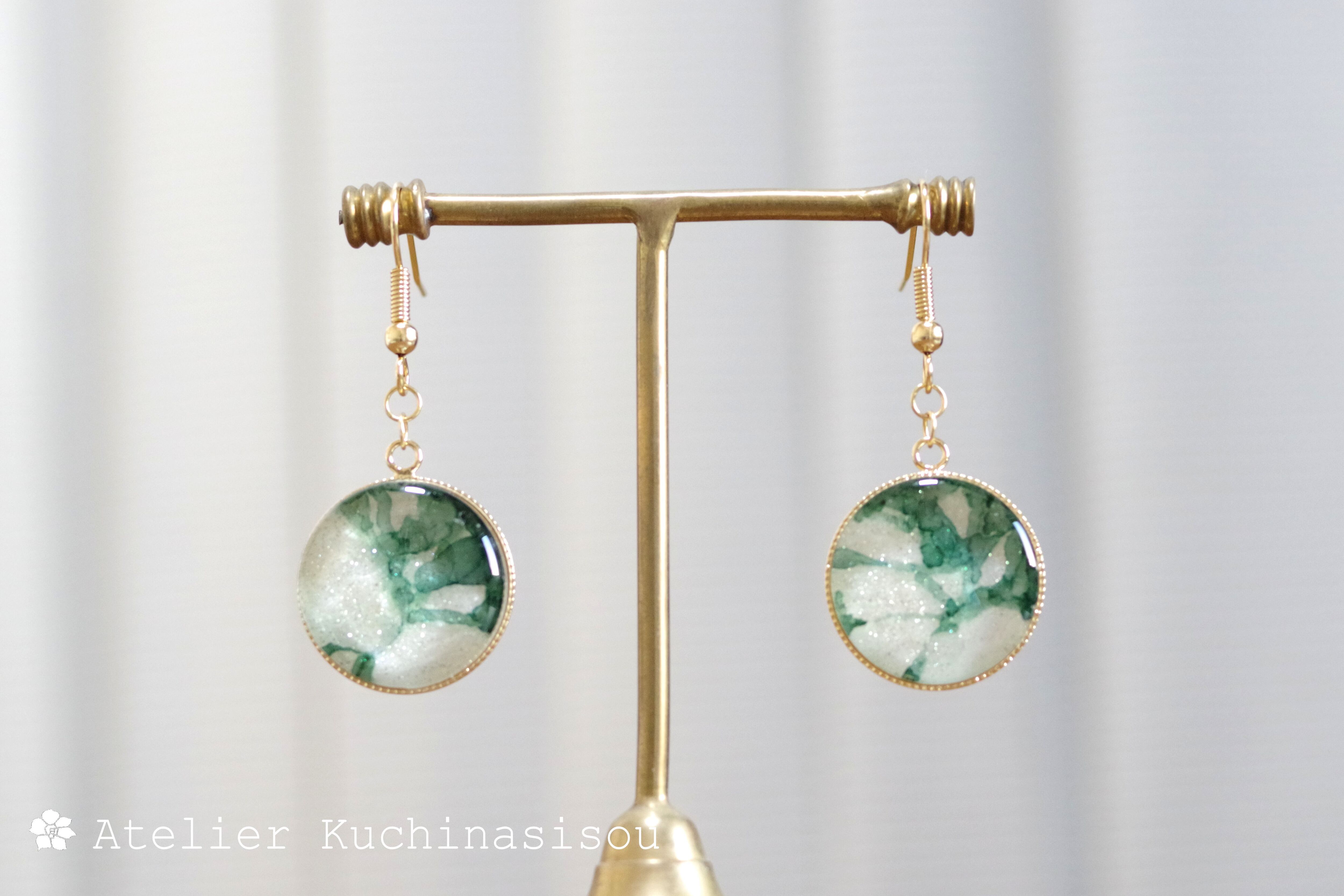 真珠色の光沢に緑色の模様が映えるピアス。一つとして同じ模様はない、一期一会のアクセサリーです。
