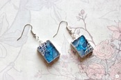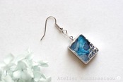 二種類のブルーが滲みあうレジンを銀色で縁取り、青海波模様を描いた、小さな玉手箱のようなピアス。