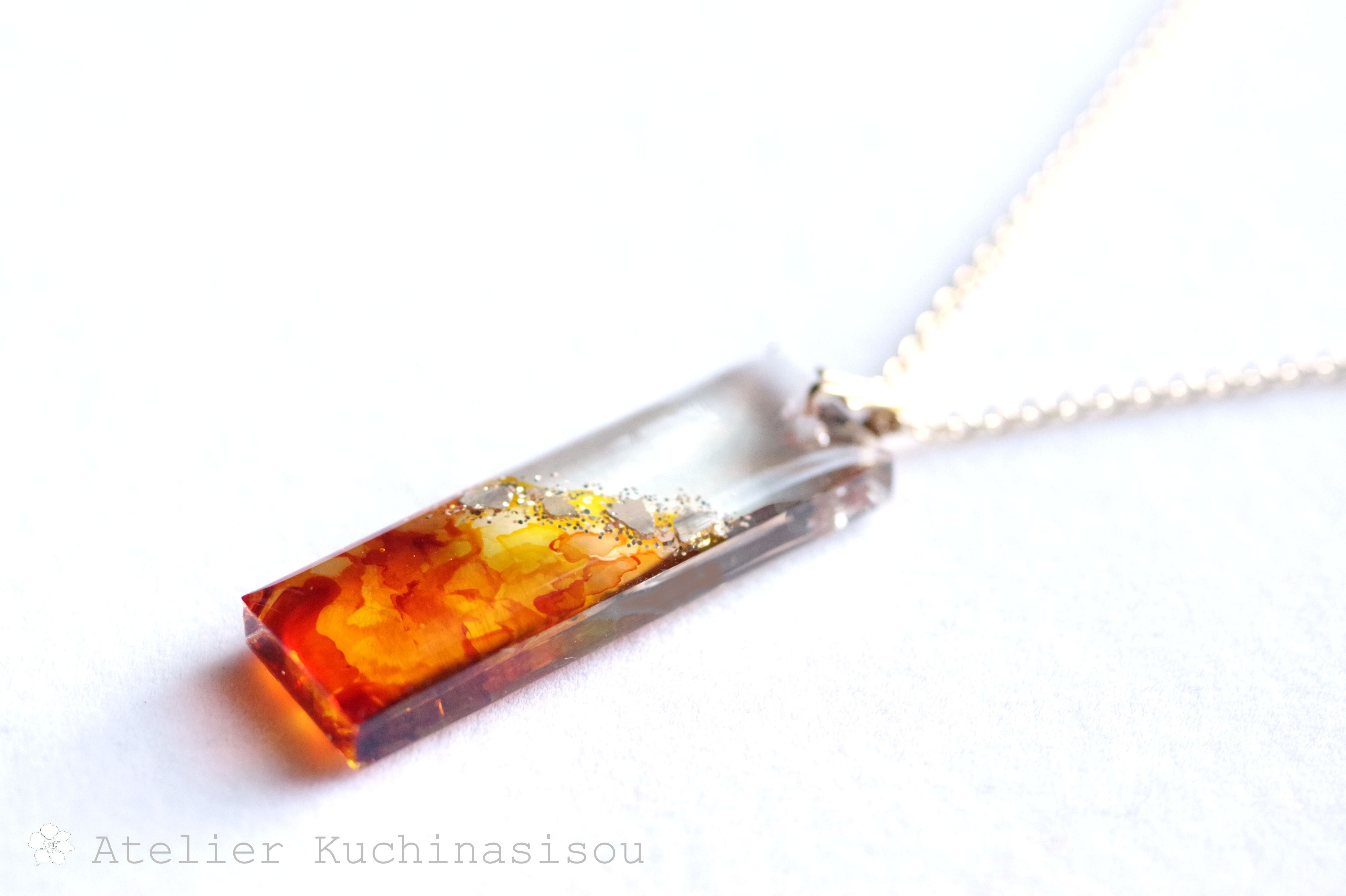 長方形のレジンを数種類のオレンジとイエローで染めたピアス。