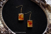 数種類のイエローとオレンジが滲みあうレジンを金色で縁取り、青海波模様を描いた、小さな玉手箱のようなピアス。