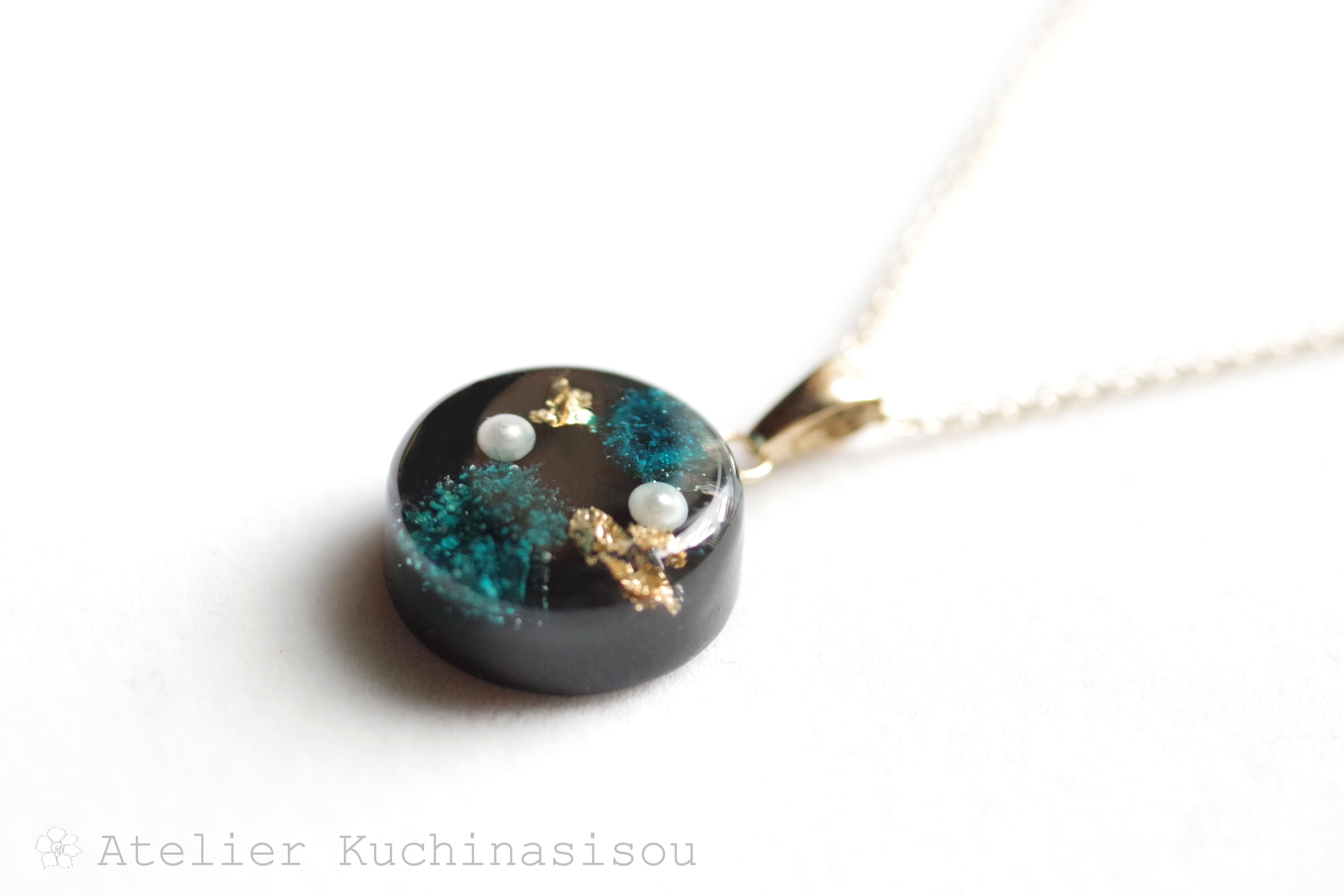 黒に溶けそうなピーコックグリーンのお花がエキゾチックなカラーリングのペンダント。